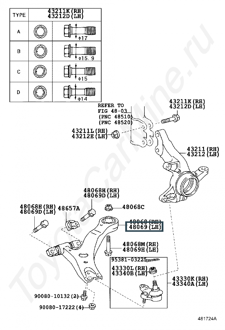 48069-0E010, ARM SUB-ASSY, FRONT SUSPENSION, LOWER NO.1 LH