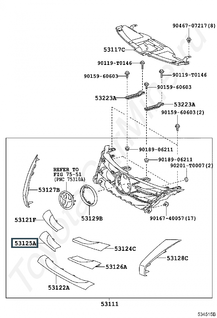 53123-0K390, MOULDING, RADIATOR GRILLE, CENTER RH