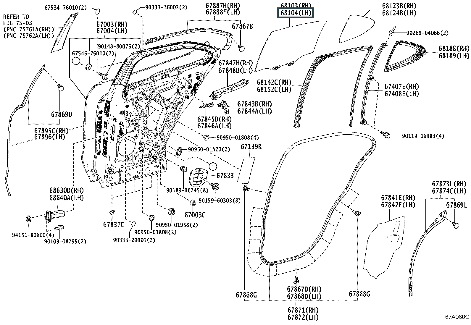 68104-76041, GLASS SUB-ASSY, REAR DOOR, LH
