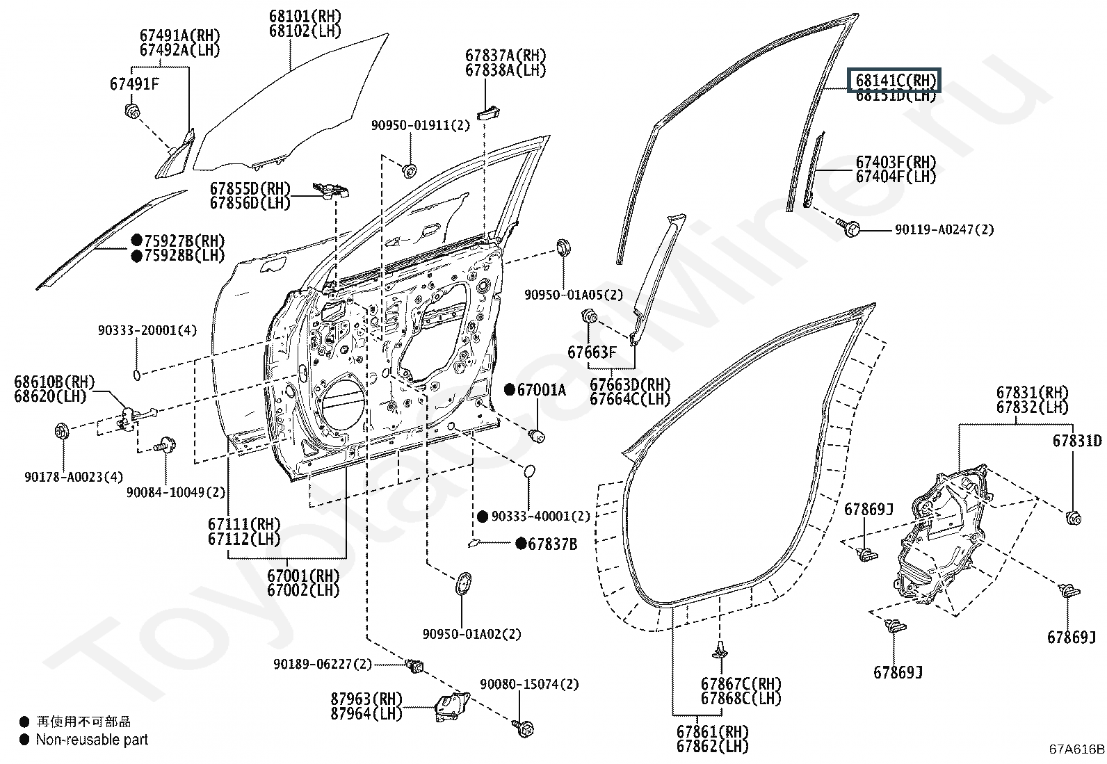 68141-0E080, RUN, FRONT DOOR GLASS, RH