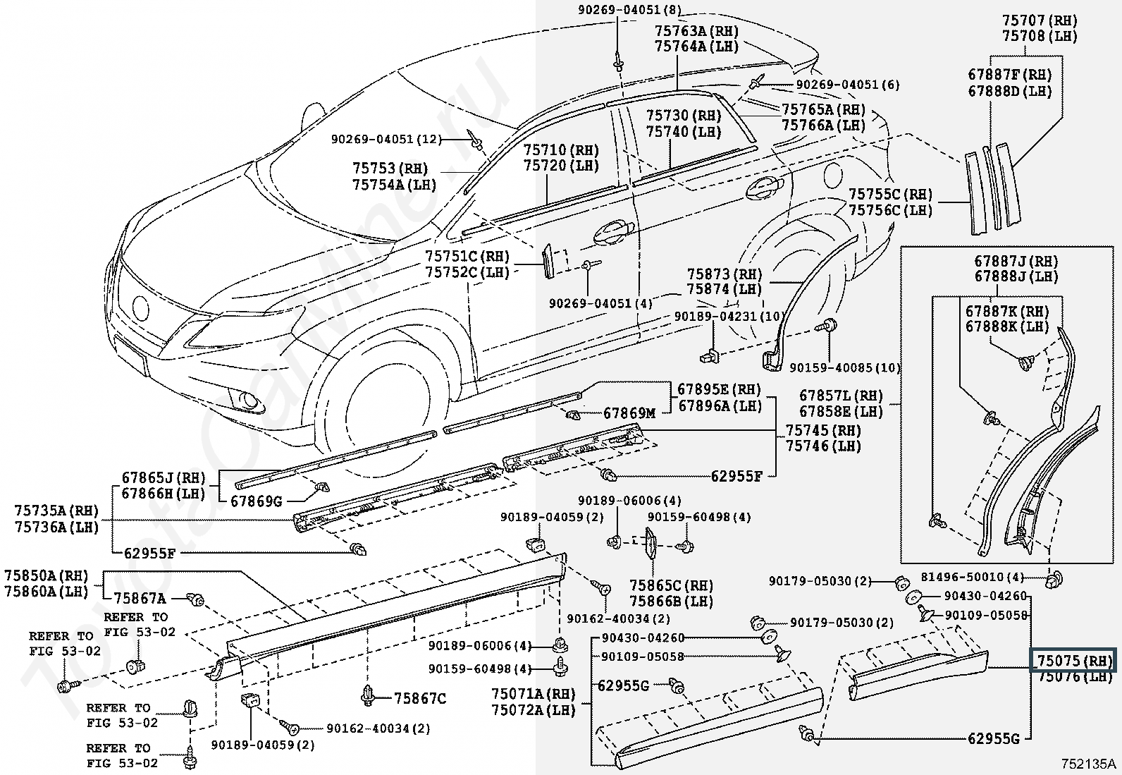 75075-48100, MOULDING SUB-ASSY, REAR DOOR, OUTSIDE RH