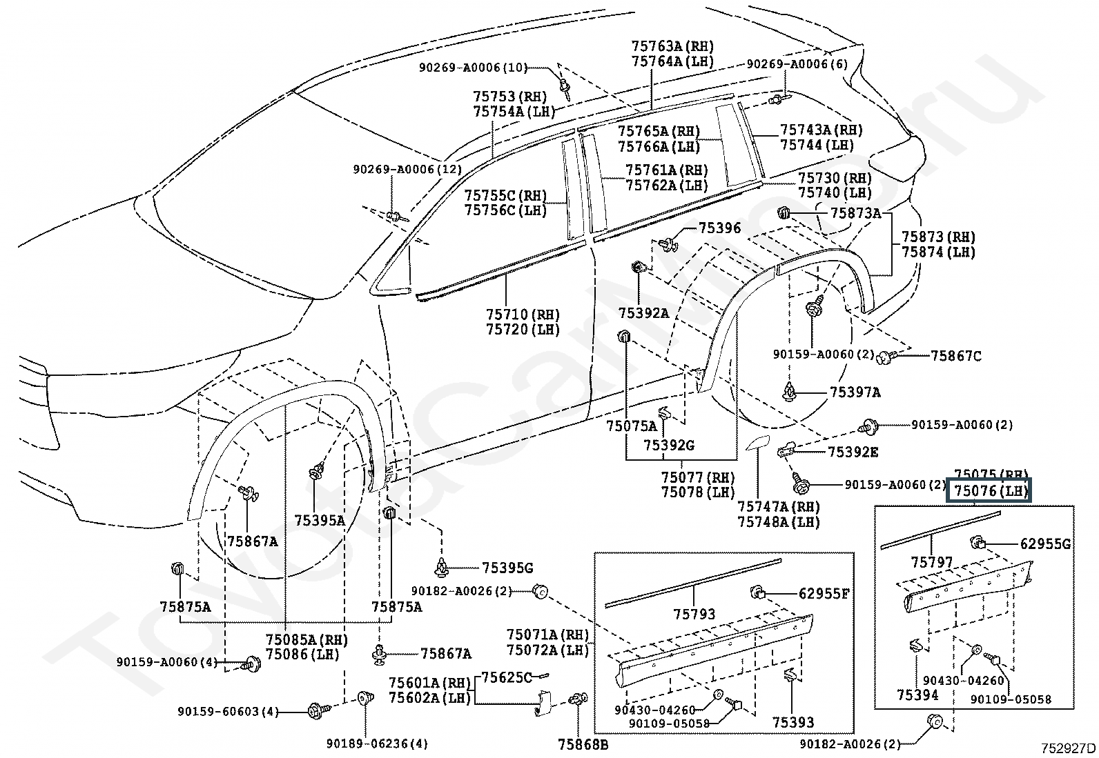 75076-0E071-B2, MOULDING SUB-ASSY, REAR DOOR, OUTSIDE LH