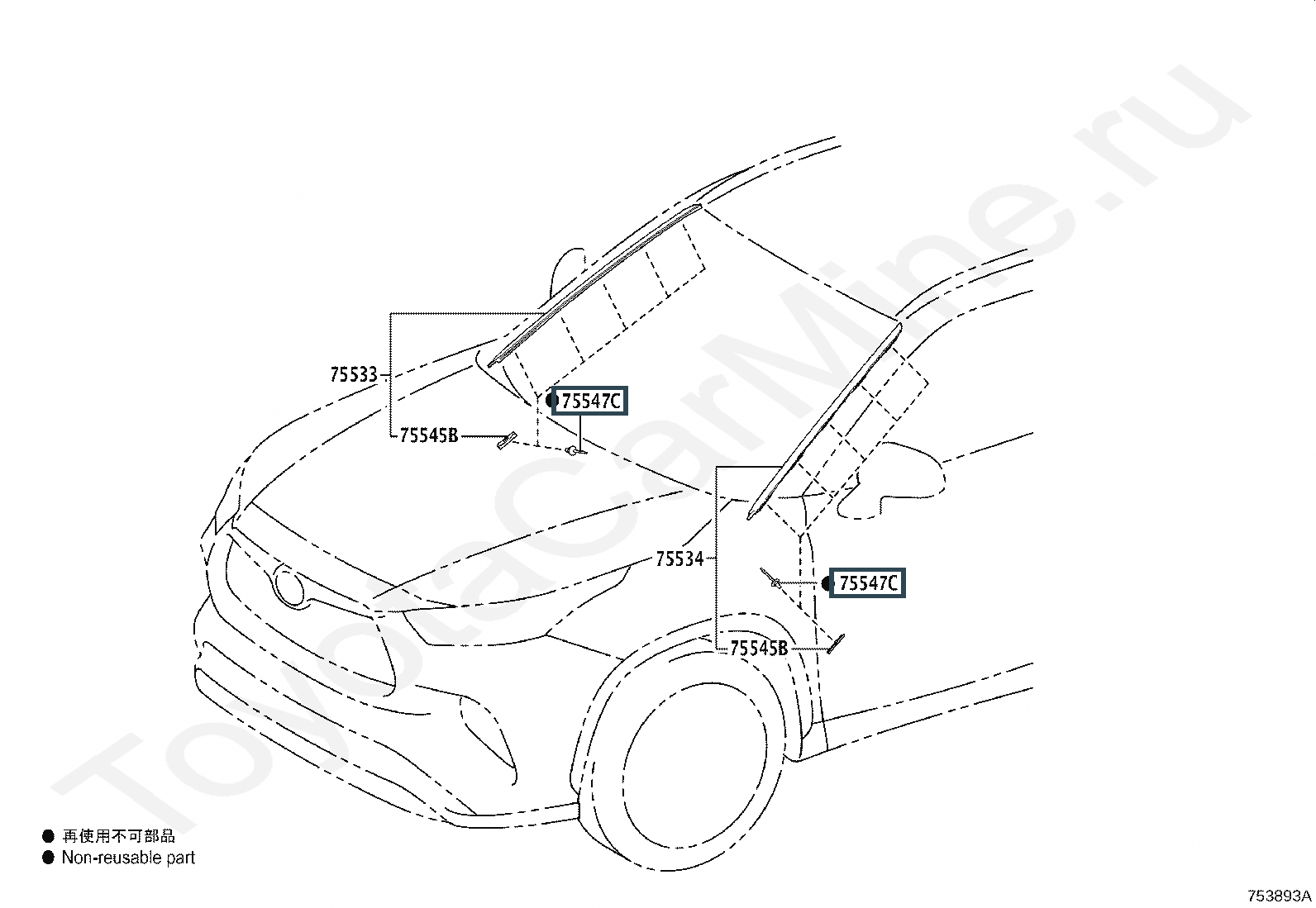 75547-0E010, CLIP, WINDSHIELD OUTSIDE MOULDING, NO.3