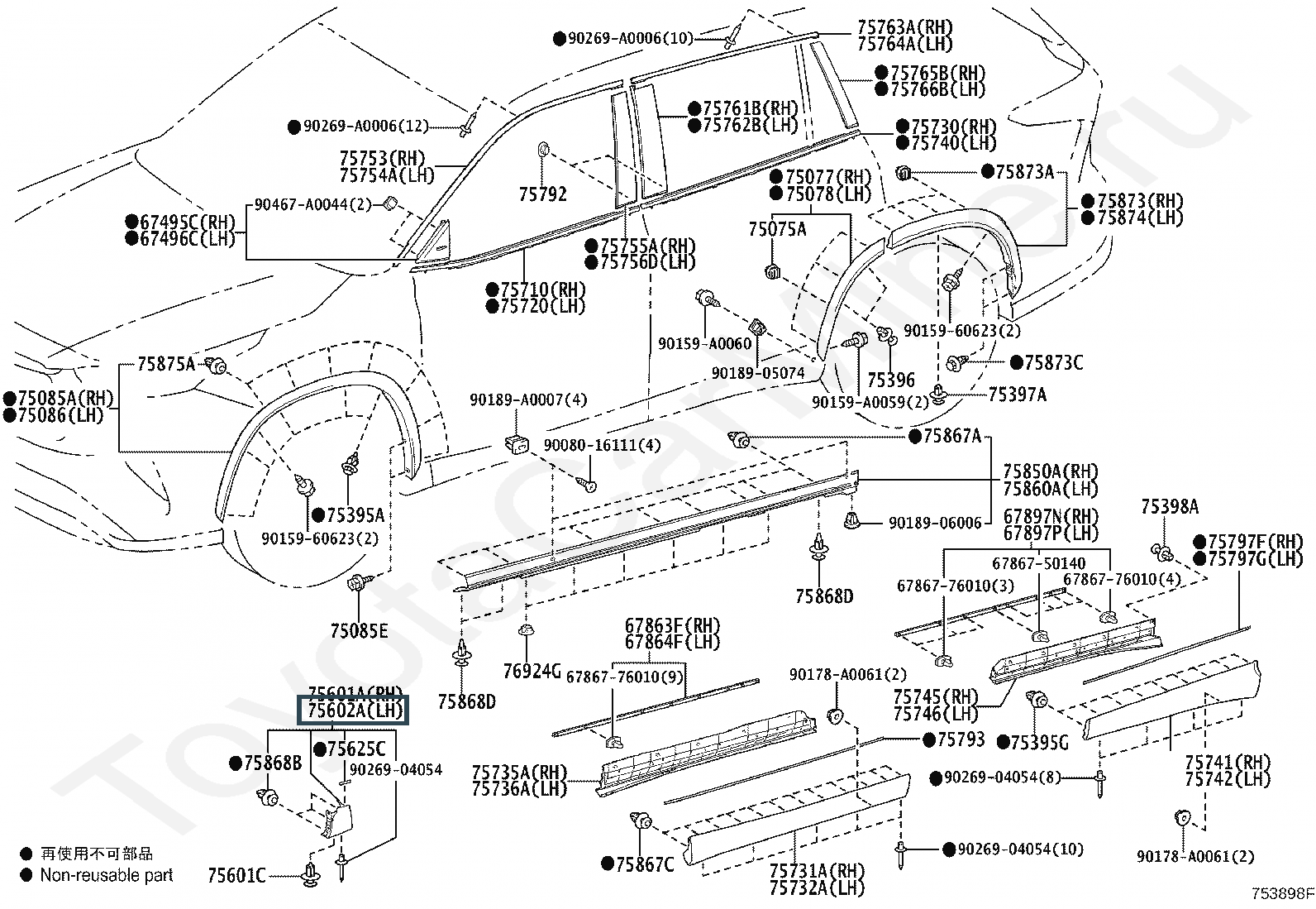 75602-0E090-C0, MOULDING SUB-ASSY, FRONT FENDER, LH