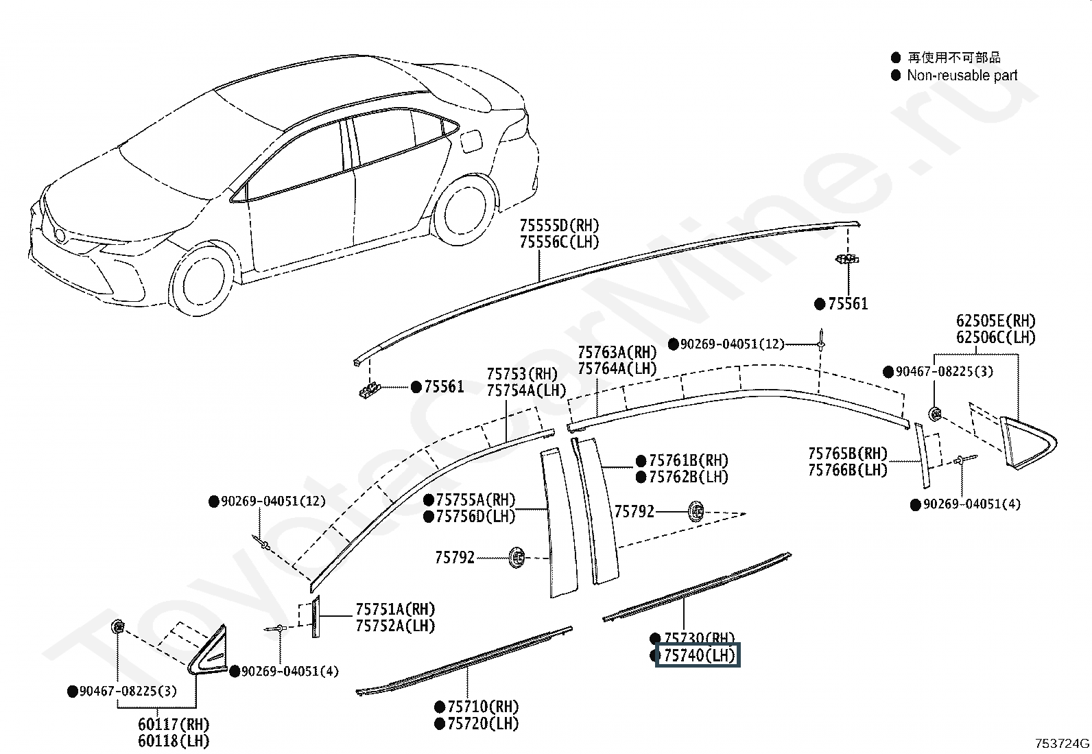 75740-02490, MOULDING ASSY, REAR DOOR BELT, LH