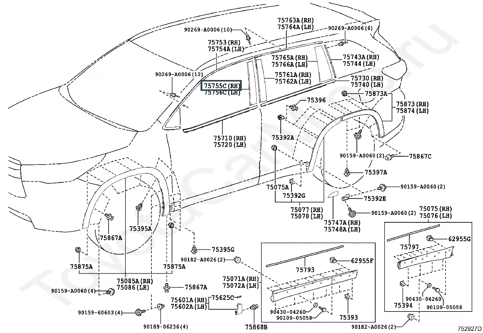 75755-0E031, MOULDING, FRONT DOOR WINDOW FRAME, REAR RH