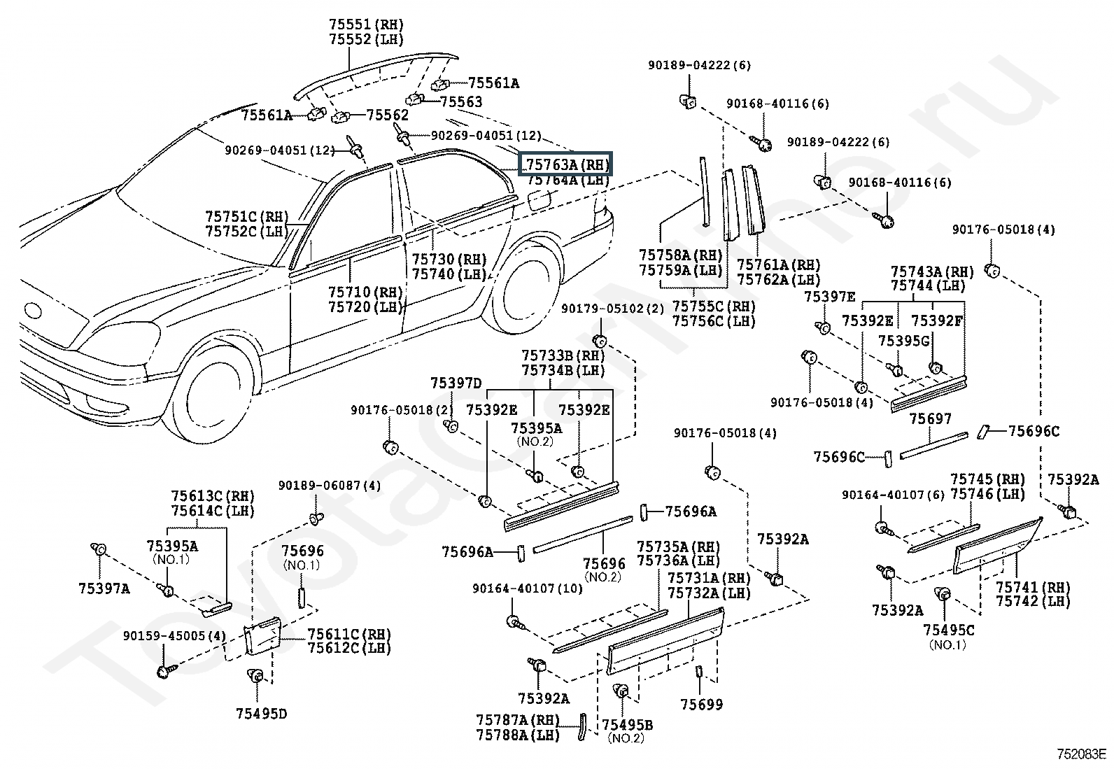 75763-50010, MOULDING, REAR DOOR WINDOW FRAME, UPPER RH