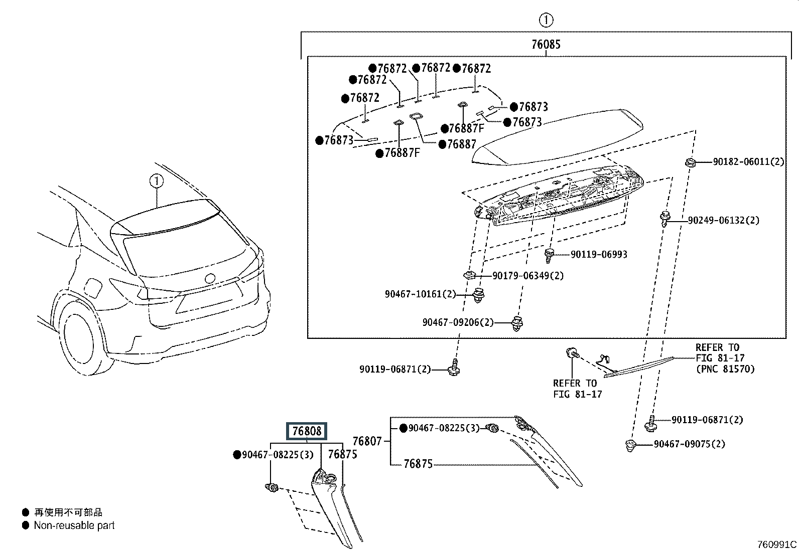 76808-48011, PROTECTOR SUB-ASSY, REAR SPOILER, SIDE LH