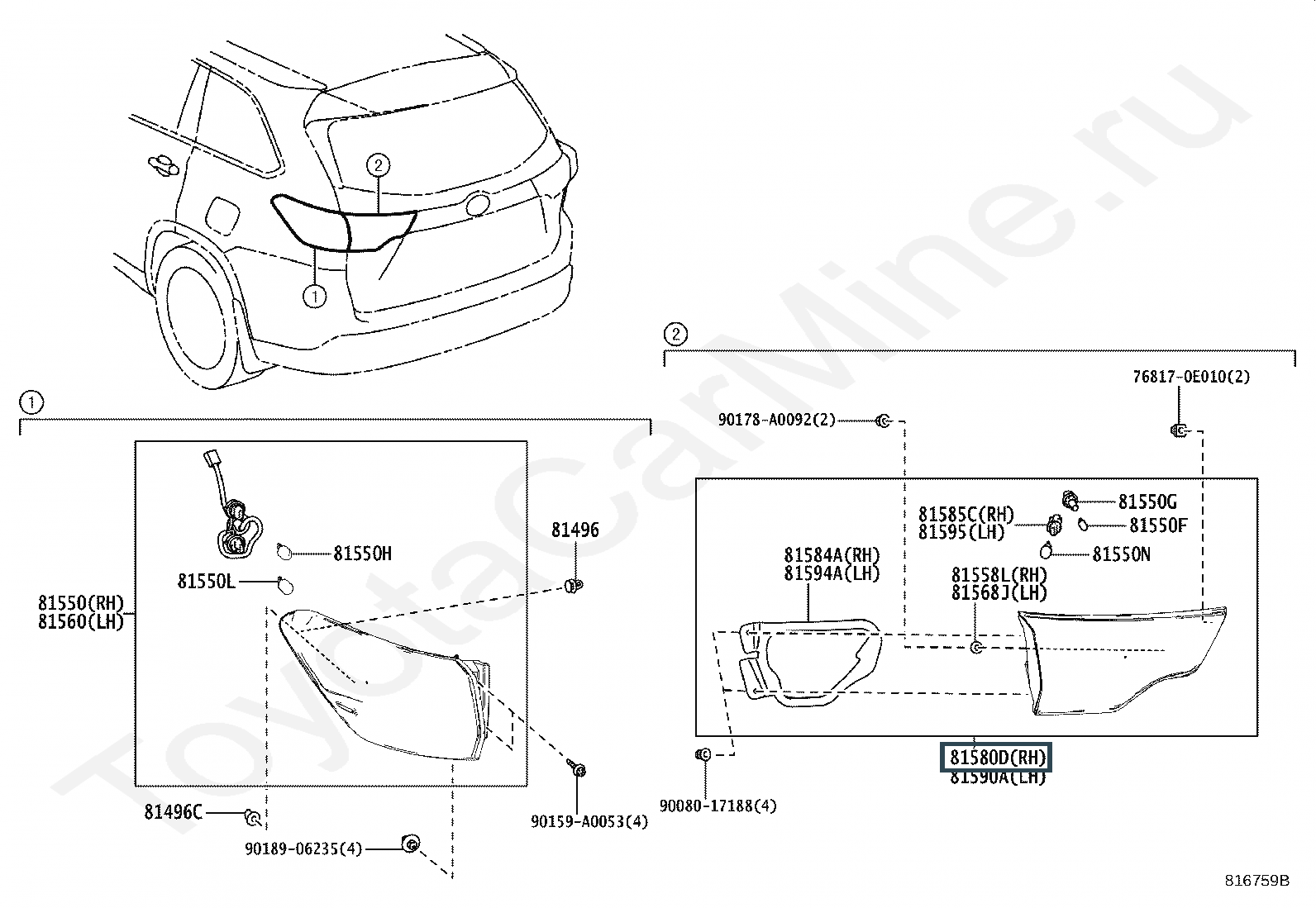 81580-0E120, Фонарь задний правый внутренний